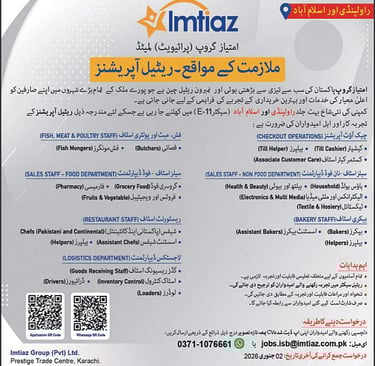 Imtiaz Supermarket has announced new job opportunities in Islamabad and Rawalpindi for Sales Staff and other positions for December 2025 / 2026. These roles are ideal for candidates seeking employment in the retail sector, offering a professional work environment, competitive salaries, and growth opportunities in one of Pakistan’s leading supermarket chains. Organization: Imtiaz Supermarket Positions: Sales Staff & Others Job Type: Private / Retail Sector Locations: Islamabad & Rawalpindi Hiring Period: December 2025 / 2026